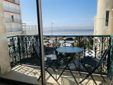 SEJOUR(26m2, expo sud-ouest et sud-est) carrelage au sol, canapé, 2 lits gigognes. Baie vitrée sur balcon avec pleine vue mer, TV. CUISINE LABORATOIRE(4.2m2) avec vue mer, évier 2 bacs, réfrigérateur + partie congélateur, micro-ondes grille, plaque de cuisson 2 feux gaz + 2 feux électriques, Lave-vaisselle.