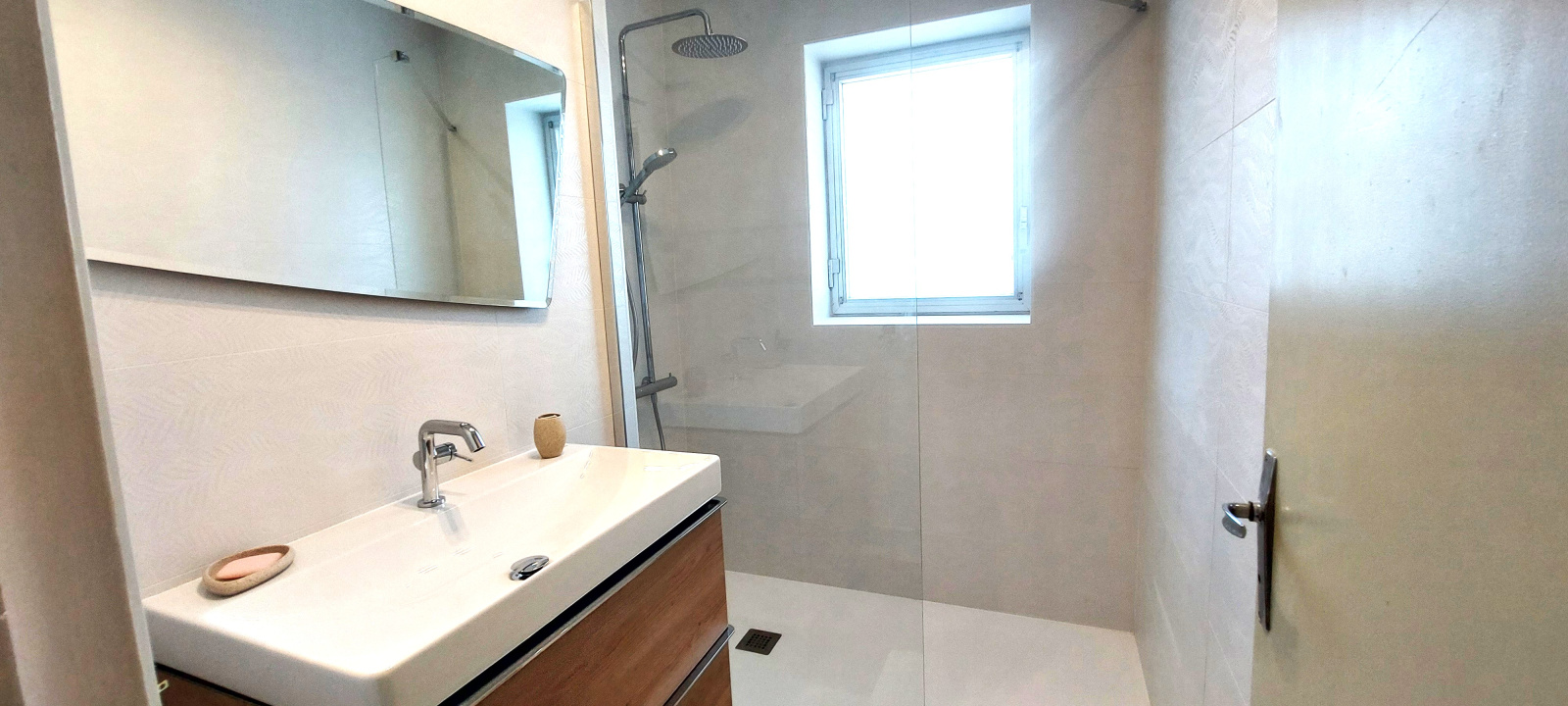 salle de bains : carrelage au sol, lavabo, baignoire.