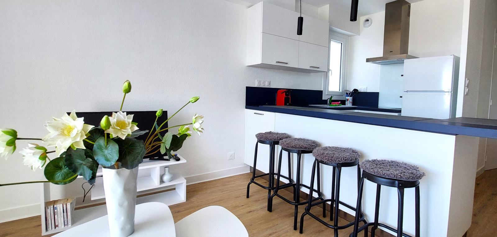 Celui-ci vous offre: Une entrée, un séjour salon avec parquet flottant au sol, canapé convertible 2 places, une TV. Une grande cuisine équipée d'un four, d'une plaque de cuisson deux feux, une hotte, machine à laver, lave-vaisselle, évier 1 bac, une machine à café Nespresso, un réfrigérateur avec partie congélateur. Une chambre avec parquet flottant au sol, lit de 140 + placard penderie. Une salle d'eau avec douche, lavabo et sèche serviette. WC indépendant.
