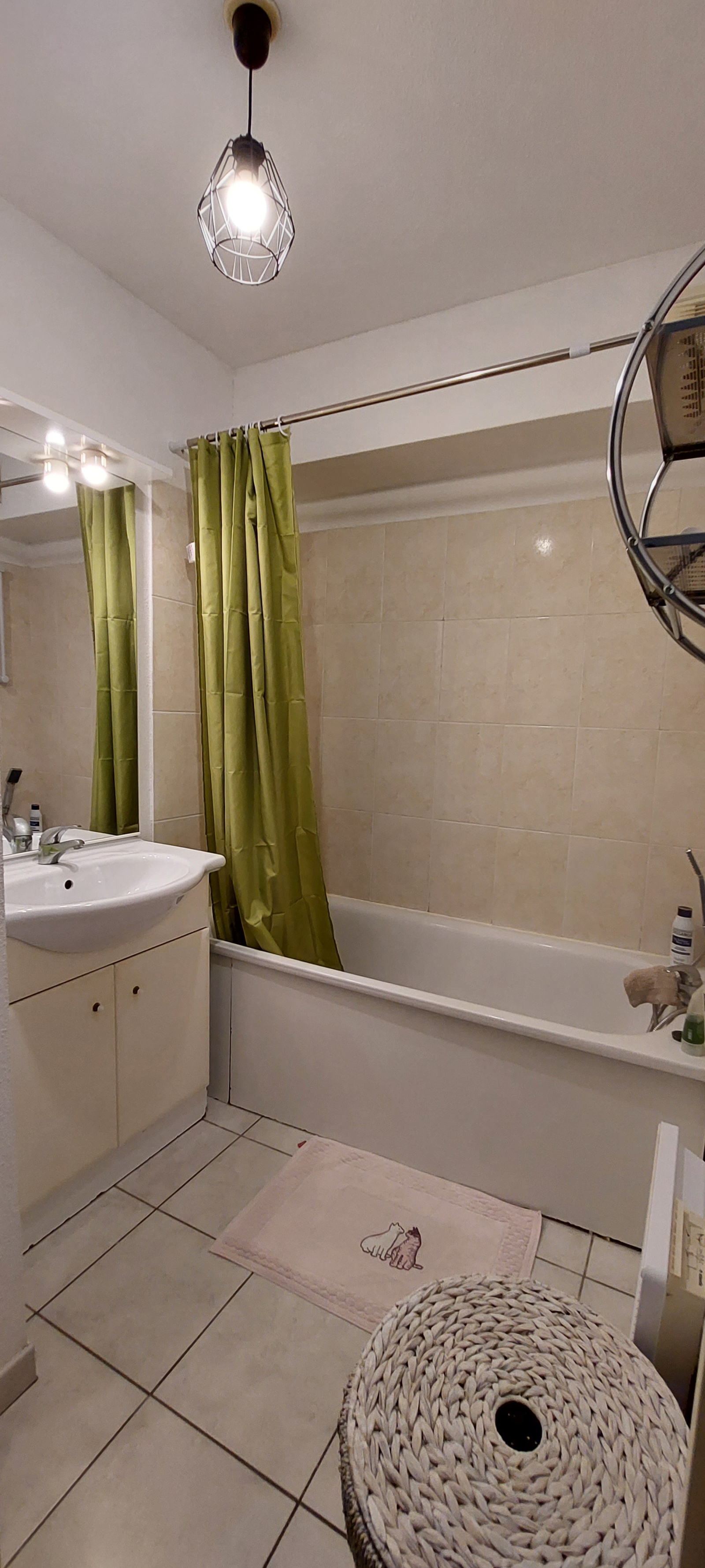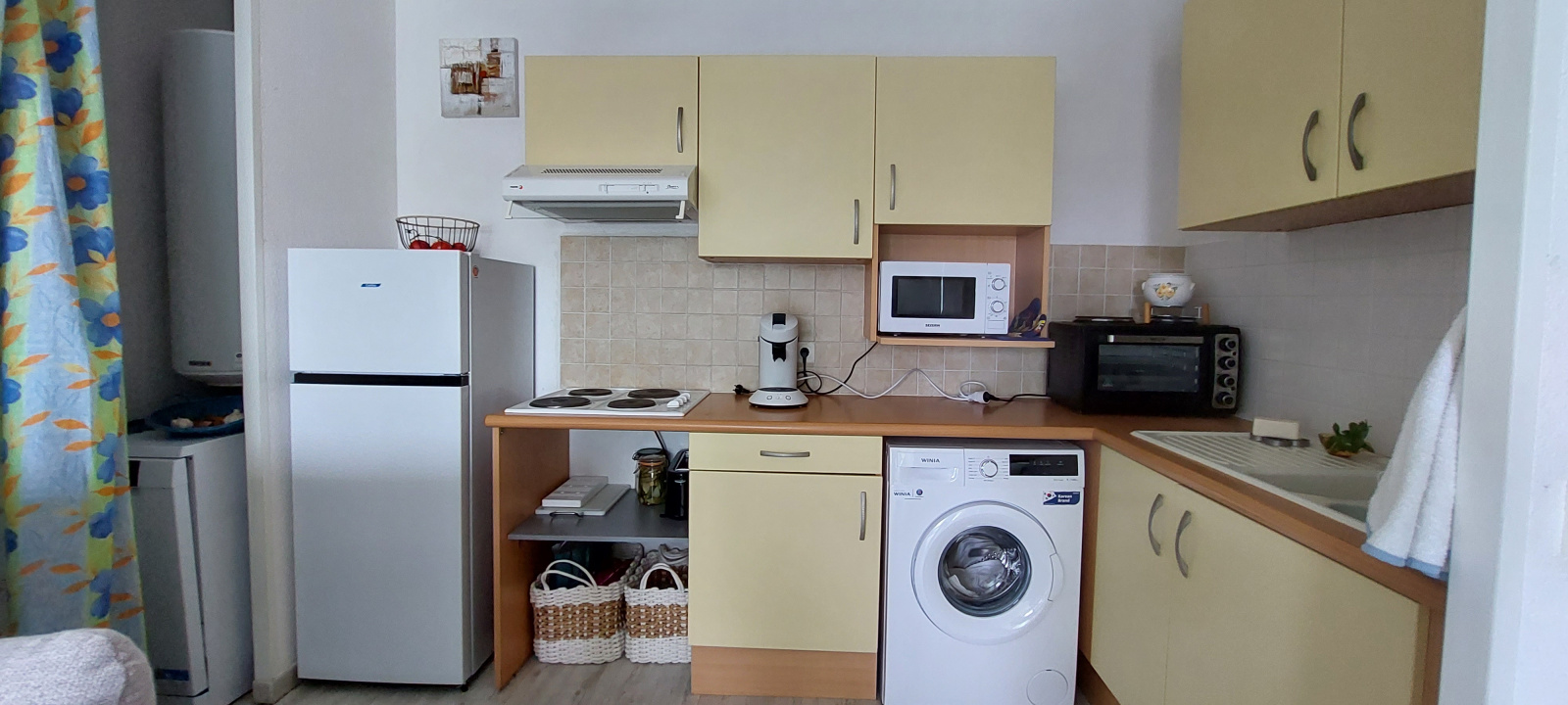 Celui-ci vous offre: UNE ENTREE avec carrelage au sol, placard penderie- COIN SALON ( parquet flottant) avec TV, canapé convertible 2 personnes, connexion internet (WIFI) UNE CUISINE (parquet flottant) ouverte équipée d'une plaque de cuisson électrique 4 feux, une hotte, réfrigérateur avec partie congélateur, micro-ondes, four grille, cafetière SENSEO, lave-linge, lave-vaisselle, évier 2 bacs - UN COIN NUIT (lino au sol) avec lit de 140 + placard penderie - UNE SALLE DE BAIN (carrelage) avec baignoire et lavabo et sèche-serviette- WC indépendant.