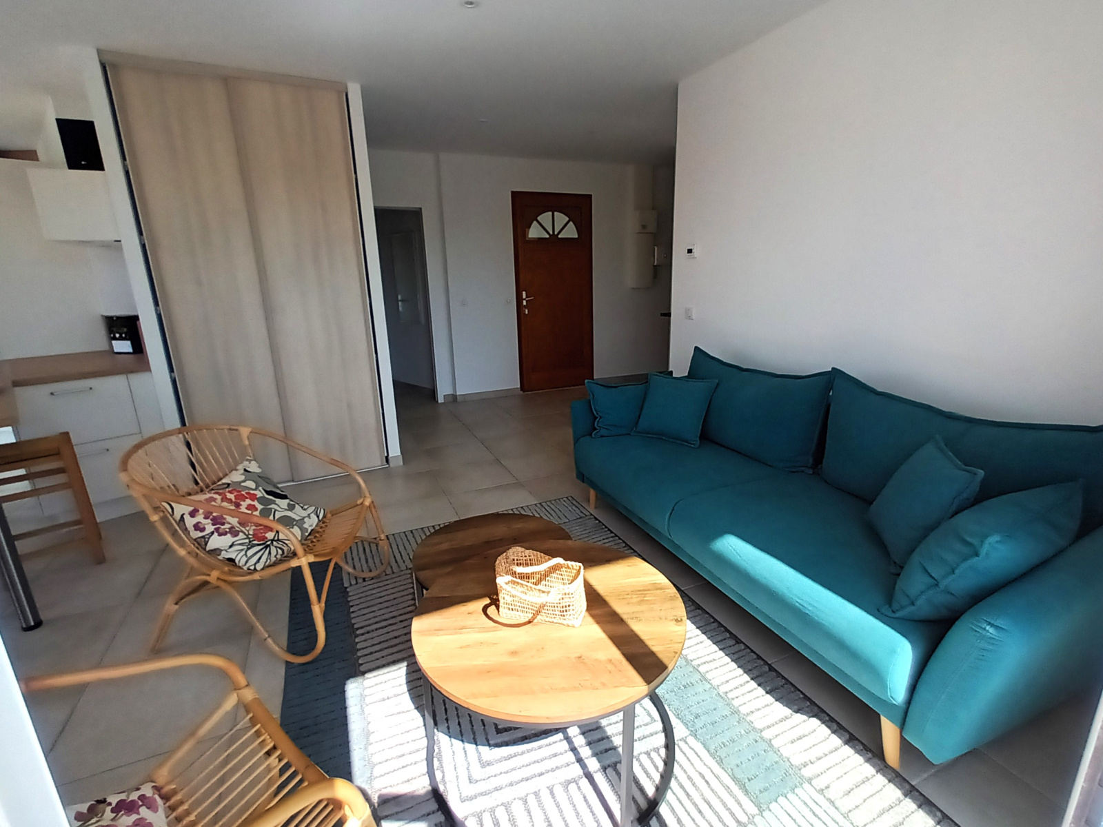 Celui-ci vous offre: UN SEJOUR avec carrelage au sol, un canapé convertible - TV - CUISINE OUVERTE ( carrelage au sol) équipée d'un four, micro-ondes, hotte, plaque vitro, lave-vaisselle, réfrigérateur, cafetière à filtre. Grandes baies vitrées donnants sur le balcon.