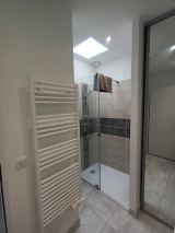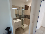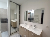 UNE SALLE D'EAU ( carrelage) avec meuble double vasques, une douche + placard.