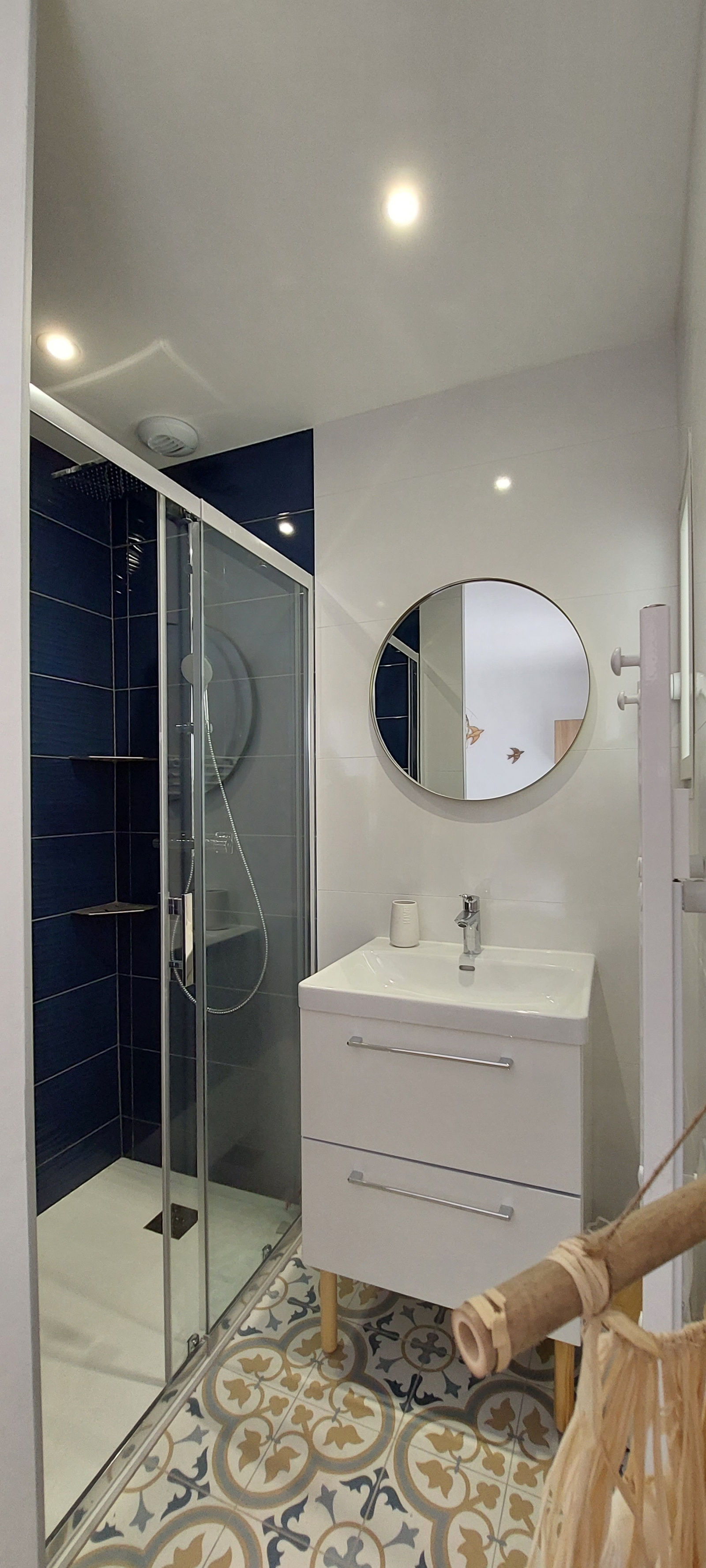 Une seconde salle d'eau avec douche et lavabo - WC séparé.