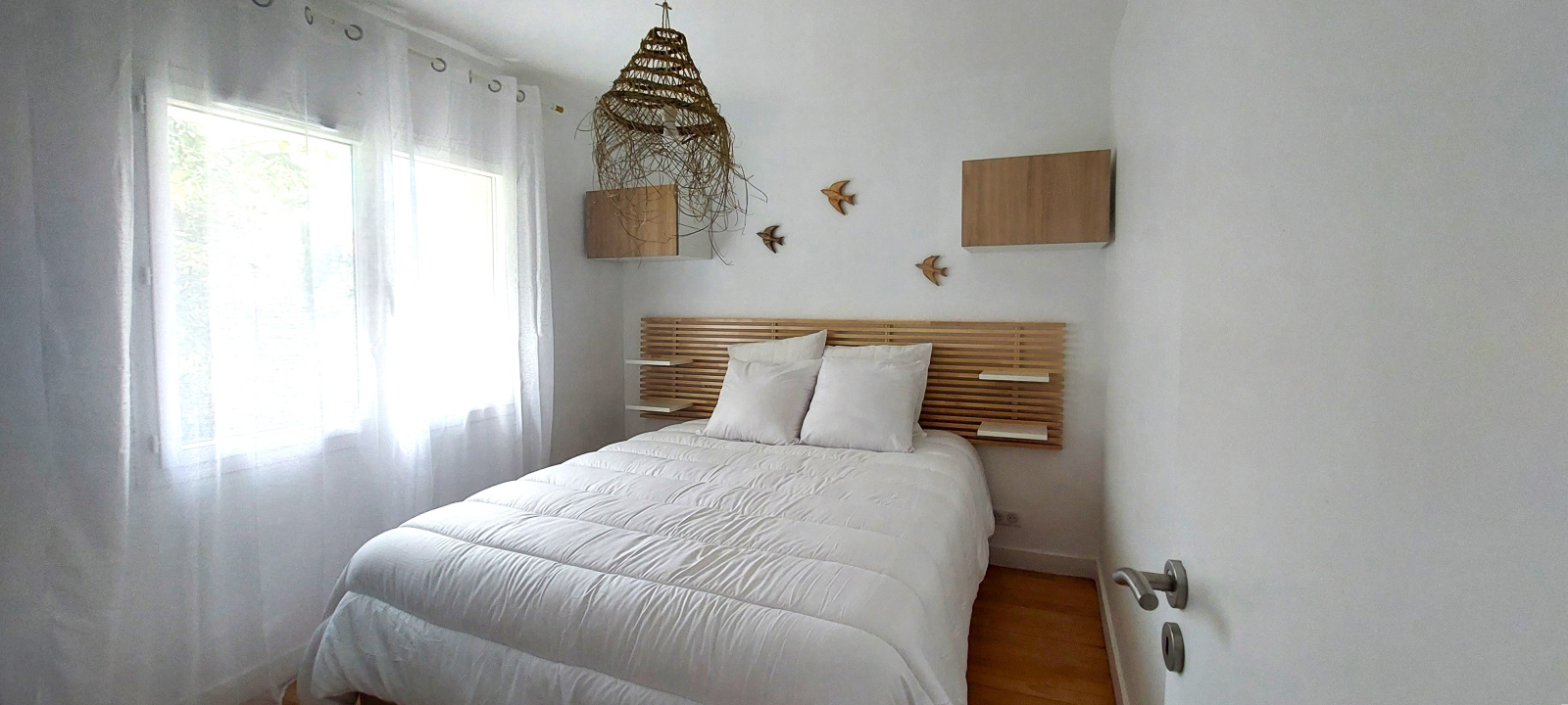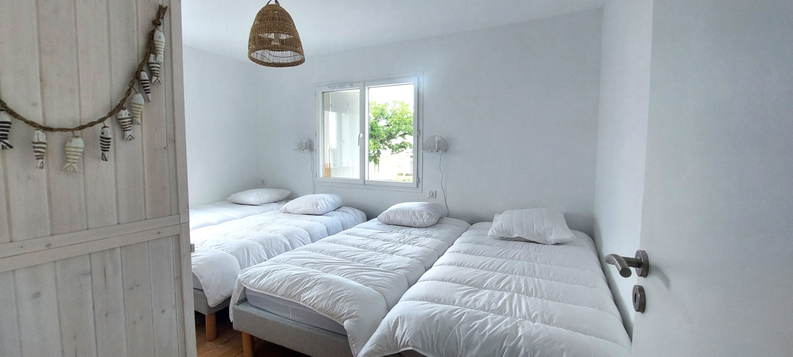 Une première chambre ( parquet au sol) lit de 160 - Une seconde chambre ( parquet ) avec 4 lits de 90 - Chambre parentale avec lit de 160 et une salle d'eau ( carrelage au sol) avec douche, lavabo et sèche serviette.