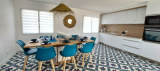 Celui-ci vous offre: Une grande pièce de vie (carrelage au sol) avec cuisine ouverte équipée d'une plaque de cuisson, un four, un micro-onde, évier un bac, cafetière classique à filtre + une NESPRESSO, bouilloire, lave-linge, lave-vaisselle, réfrigérateur. Un coin salon avec canapé, TV et climatisation.