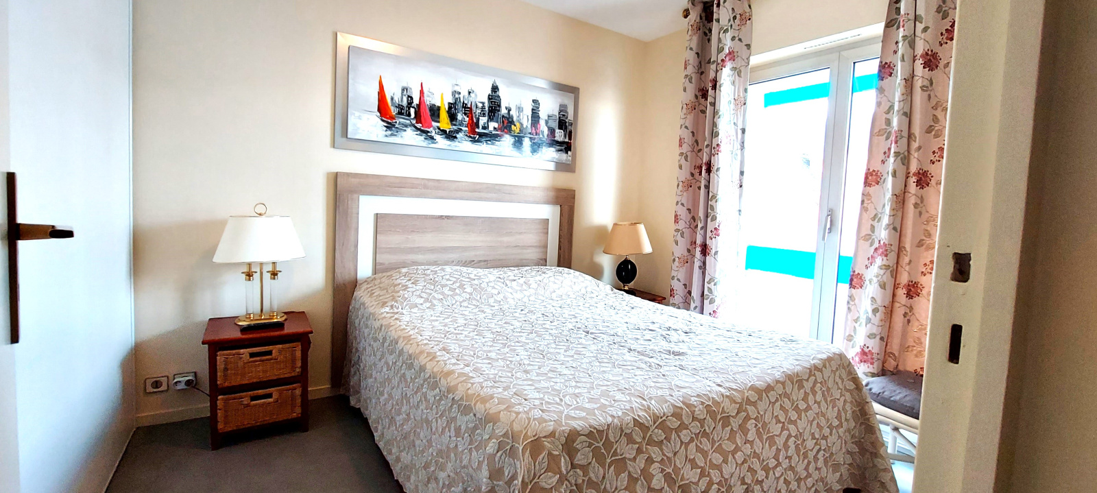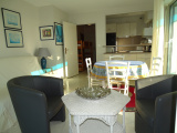 ENTREE gerflex au sol. 2 lits superposés de 90. Placard rangement. ,SALLE DE BAINS : carrelage au sol, baignoire, lavabo, bidet, lave linge. ,WC indépendants. ,CHAMBRE(10m2, sud-est) : Moquette au sol, un lit de 140. Placard penderie. Balcon avec vue latérale mer. ,CUISINE : Gerflex au sol. Evier un bac, lave vaisselle, réfrigérateur table top, four électrique, table de cuisson 4 feux électriques, un four micro ondes. ,SEJOUR(18m) sud-ouest et sud-est) Gerflex au sol. clic-clac de 140, TV.