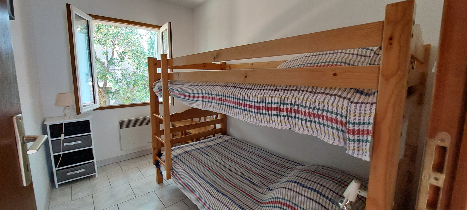 AU REZ DE CHAUSSEE : UNE CUISINE : carrelage au sol, lave vaisselle, plaque gaz 3 feux + 1 électrique, four, réfrigérateur congélateur, micro-ondes, hotte, évier un bac ½. SALLE A MANGER, SALON: parquet au sol, avec clic-clac 2 personnes et TV SALLE D’EAU : douche, lavabo, wc. ETAGE : CHAMBRE 1 : parquet au sol, 1 lit de 140. CHAMBRE 2 : parquet au sol, 1 lit de 140. DEGAGEMENT avec placard. CHAMBRE 3 : petite chambre avec 2 lits superposés de 90. SALLE D’EAU : carrelage au sol, douche, lavabo, bidet, wc. TERRASSE avec salon de jardin. GARAGE avec lave linge.