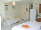 UNE ENTREE, CHAMBRE 1 : parquet flottant au sol + coin salle d’eau avec lavabo, douche. SEJOUR : carrelage au sol. Porte fenêtre sur terrasse. Réfrigérateur avec congélateur, évier un bac, hotte, plaque induction , four micro ondes, lave linge , lave vaisselle , placard.