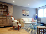 Un SEJOUR SALON traversant de 26 m2 : au sol lames stratifiées, coin repas et coin salon, un canapé, TV, porte fenêtre accèdant à la terrasse. ,