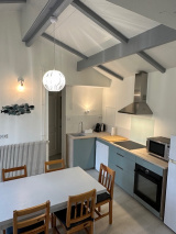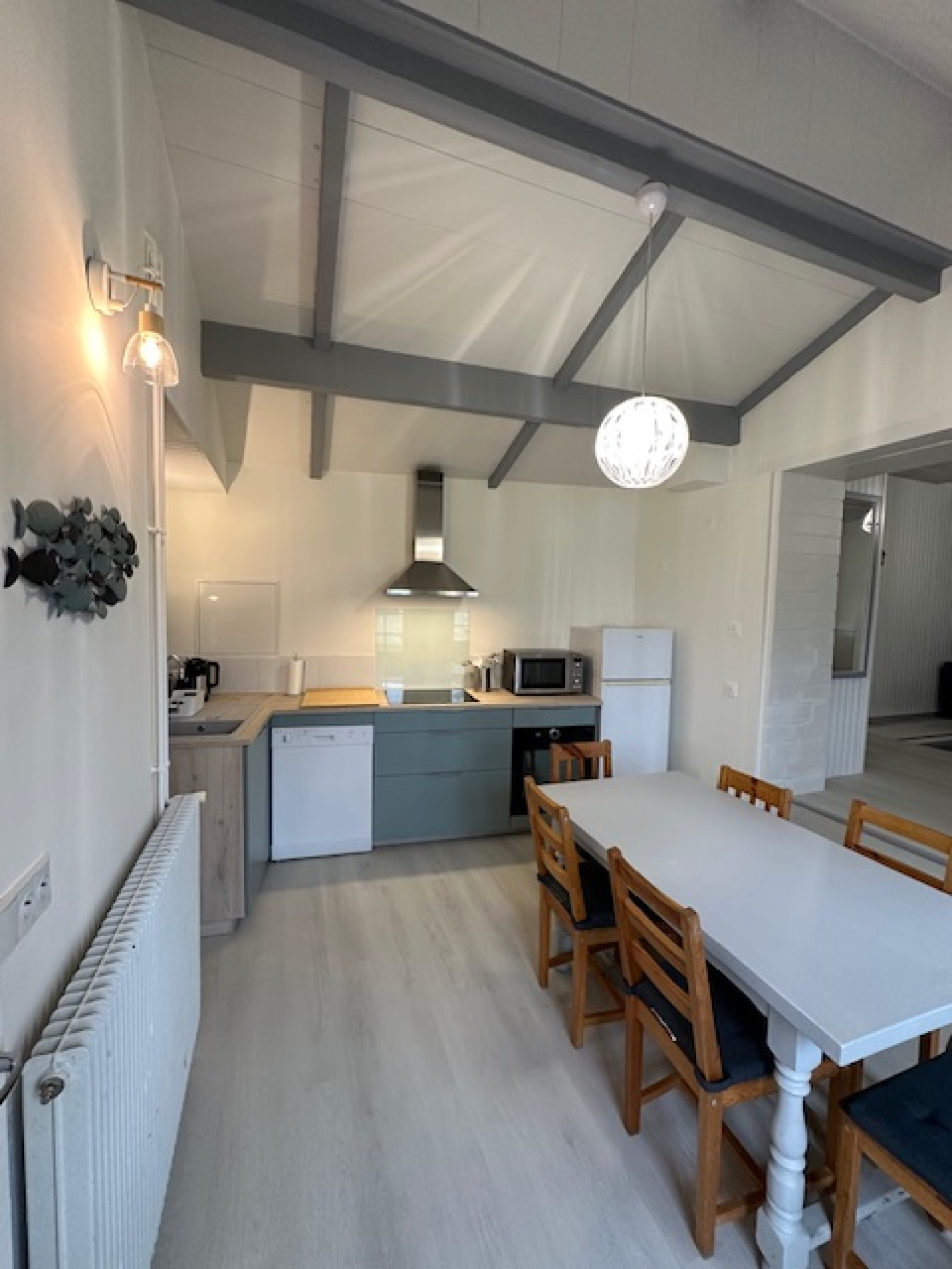 UN COIN SEJOUR SALON avec TV et canapé - UNE CUISINE équipée d'un four, plaque à induction, hotte, évier 1 bac, micro-onde, cafetière à dosettes - bouilloire - réfrigérateur avec partie congélateur - lave-vaisselle.