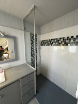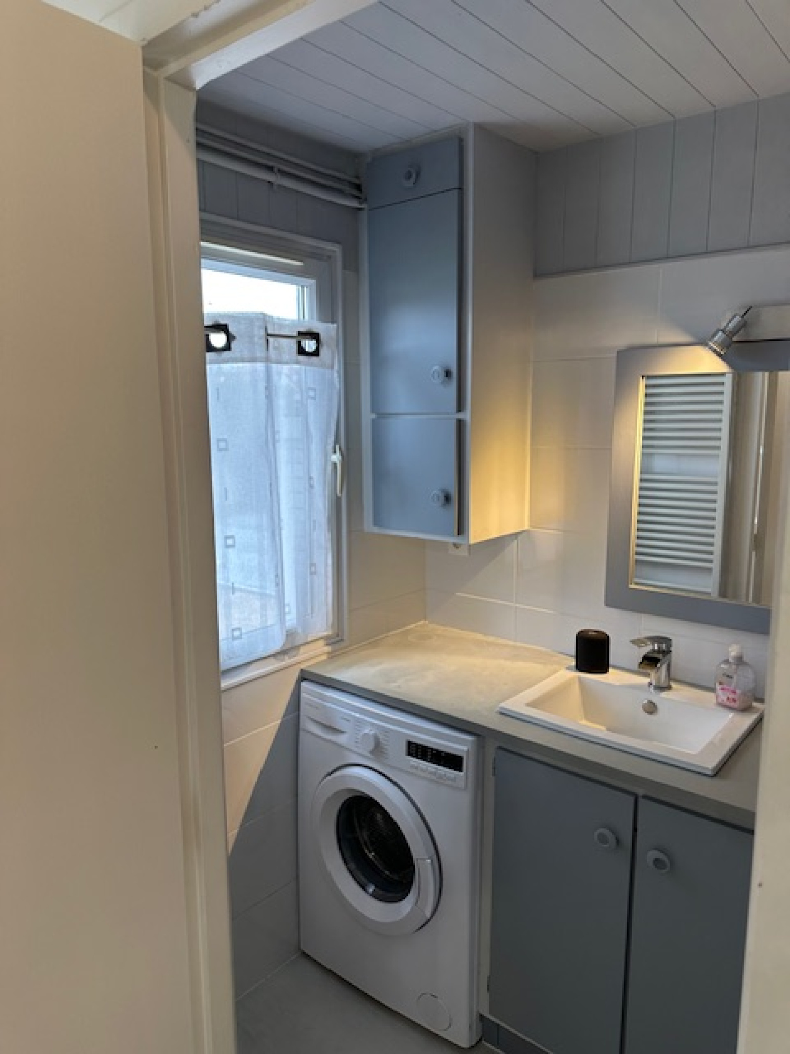 UNE SALLE D'EAU avec douche, lavabo, lave-linge.
