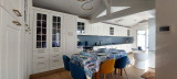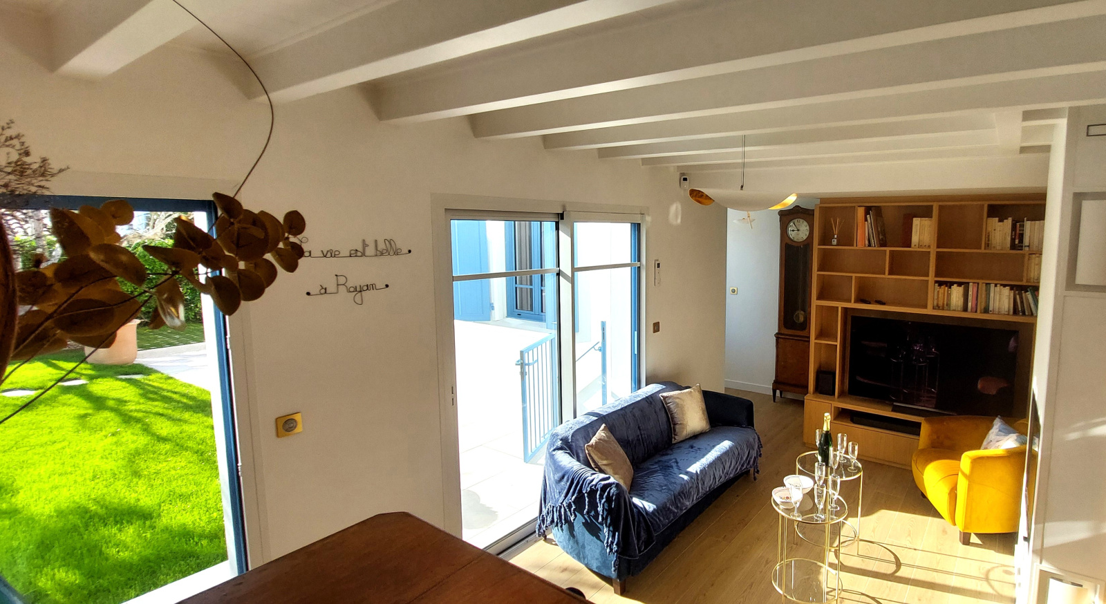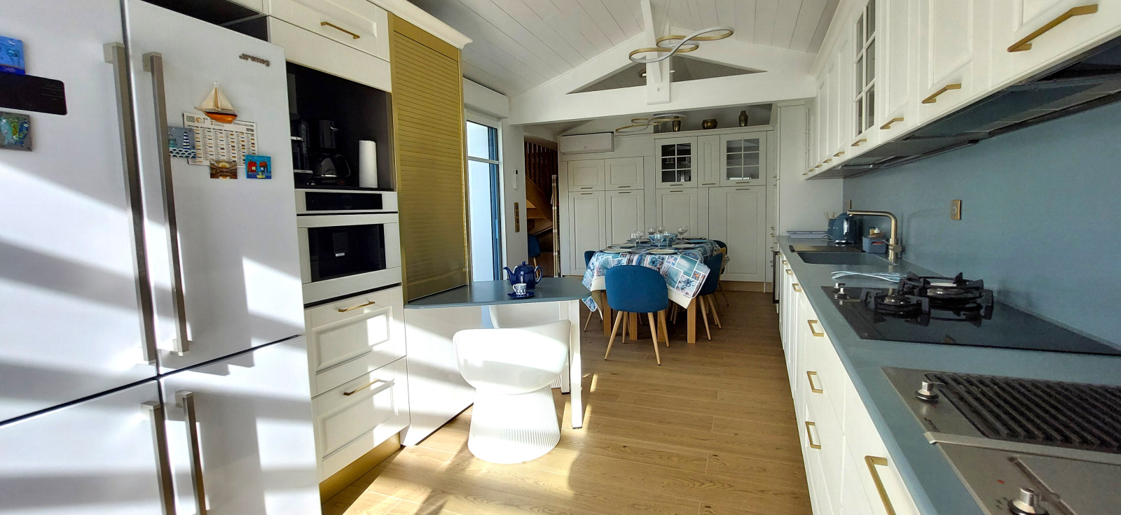Salon séjour avec canapé, TV, Une très belle cuisine composée d’un évier 1 bac, lave-linge, sèche-linge, cave à vin, plaque de cuisson avec 2 feux induction et 2 feux gaz, un grill, une friteuse, réfrigérateur américain avec partie congélateur, four, micro-ondes, hotte, cafetière à filtre et Nespresso.
