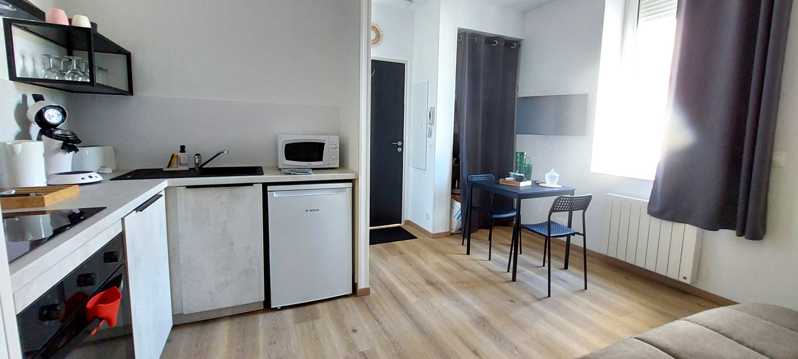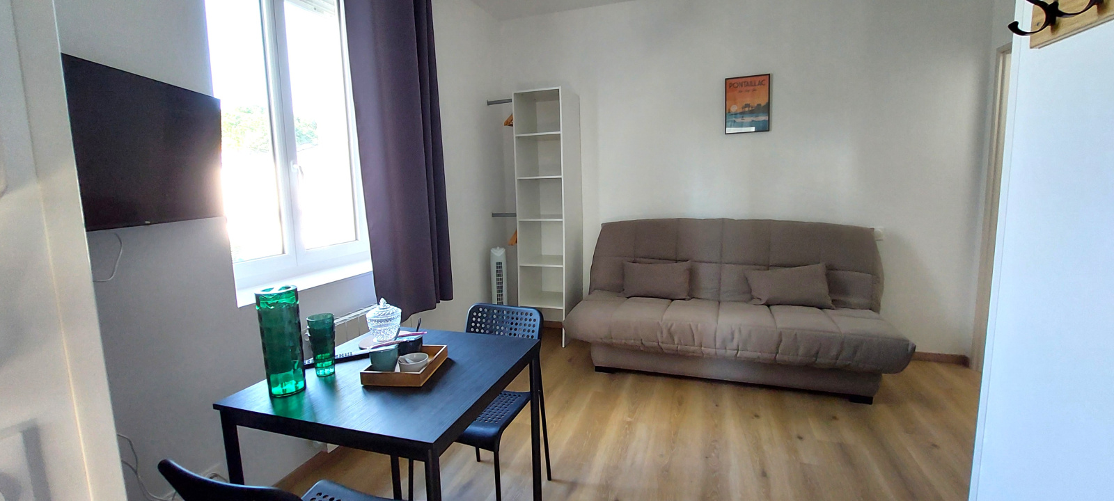 UNE PIECE PRINCIPALE composée d'un clic-clac pour 2 personnes, rangements pour les vêtements, TV - COIN CUISINE ouverte, équipée d'une plaque de cuisson induction, un four, hotte, micro-onde, frigo top avec petite partie congélateur, grille-pain, évier un bac, lave-vaisselle, cafetière SENSEO, bouilloire - UNE SALLE D'EAU avec douche, lavabo, WC et sèche-serviettes.