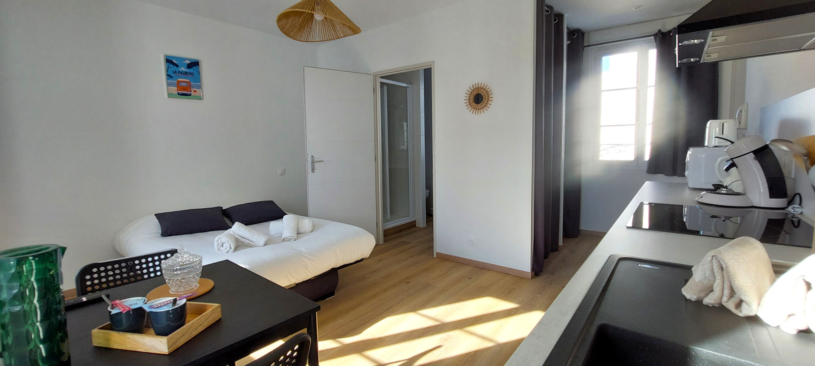 UNE PIECE PRINCIPALE composée d'un clic-clac pour 2 personnes, rangements pour les vêtements, TV - COIN CUISINE ouverte, équipée d'une plaque de cuisson induction, un four, hotte, micro-onde, frigo top , grille-pain, évier un bac, lave-vaisselle, cafetière SENSEO, bouilloire - UNE SALLE D'EAU avec douche, lavabo, WC et sèche-serviettes.