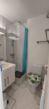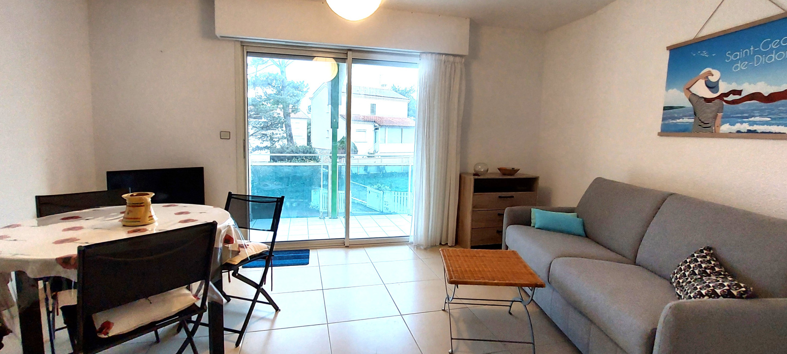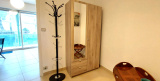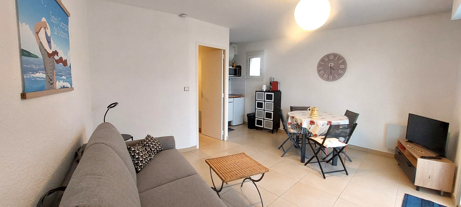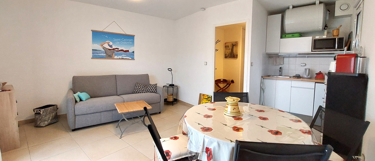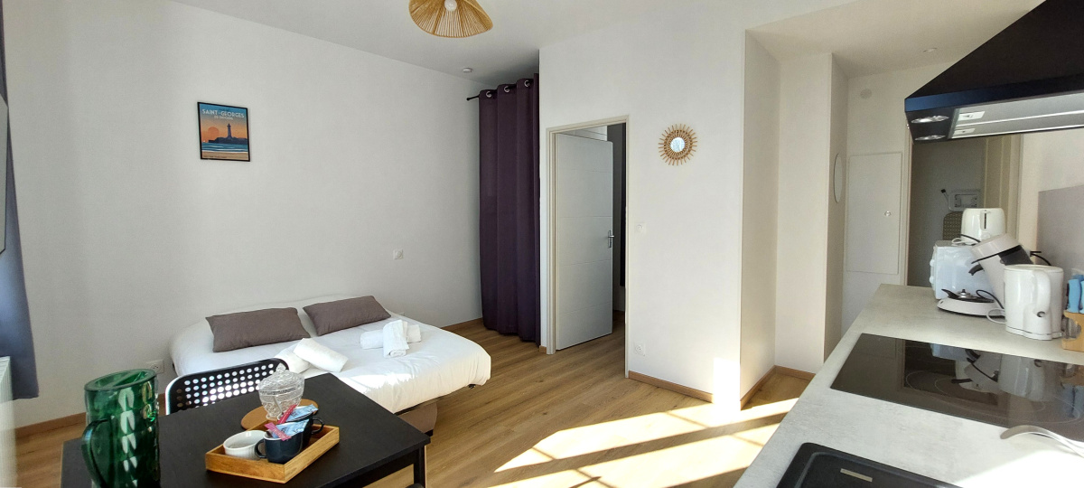 à seulement 2mn à pied de la plage et 10mn du marché du parc ce studio au 1er étage vous offre: UNE ENTREE avec placard - PIECE PRINCIPALE avec canapé convertible 2 personnes, une table, CUISINE équipée d'une plaque induction 2 feux, évier, frigo top, micro-ondes, cafetière Nespresso, grille pain - SALLE D'EAU avec douche, lavabo et WC.