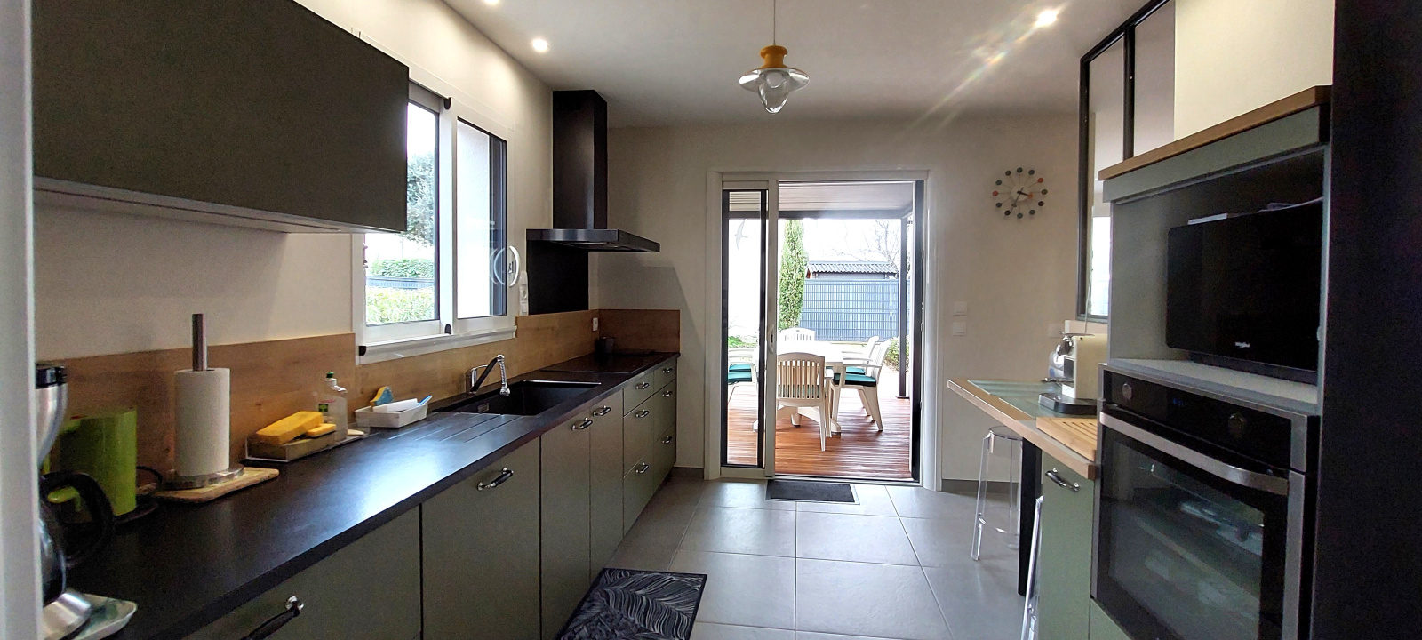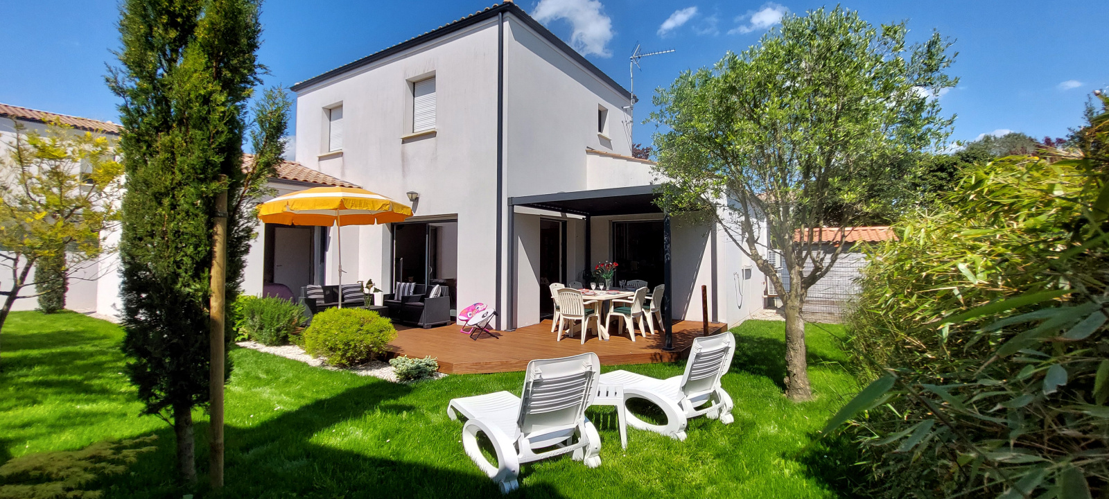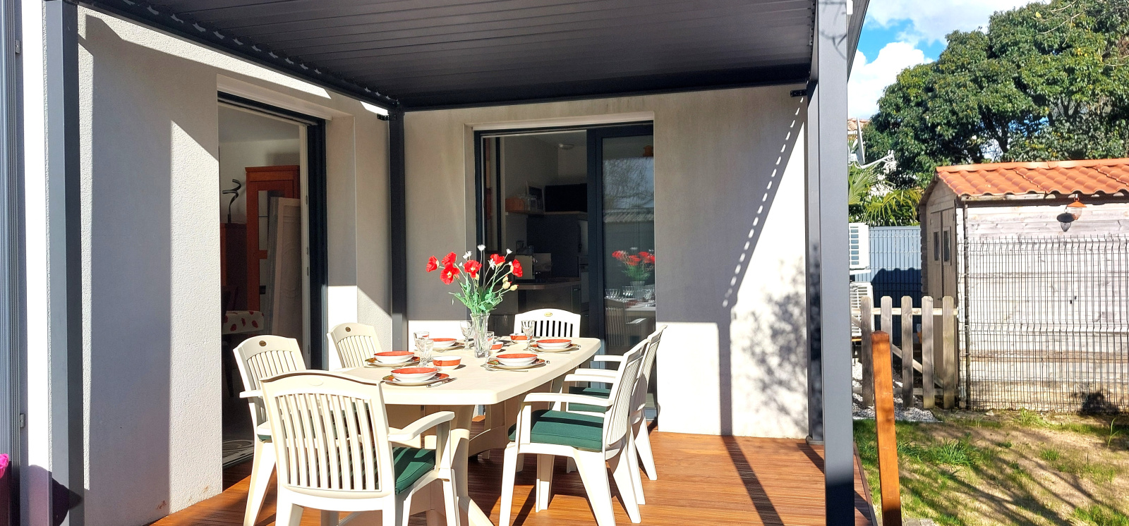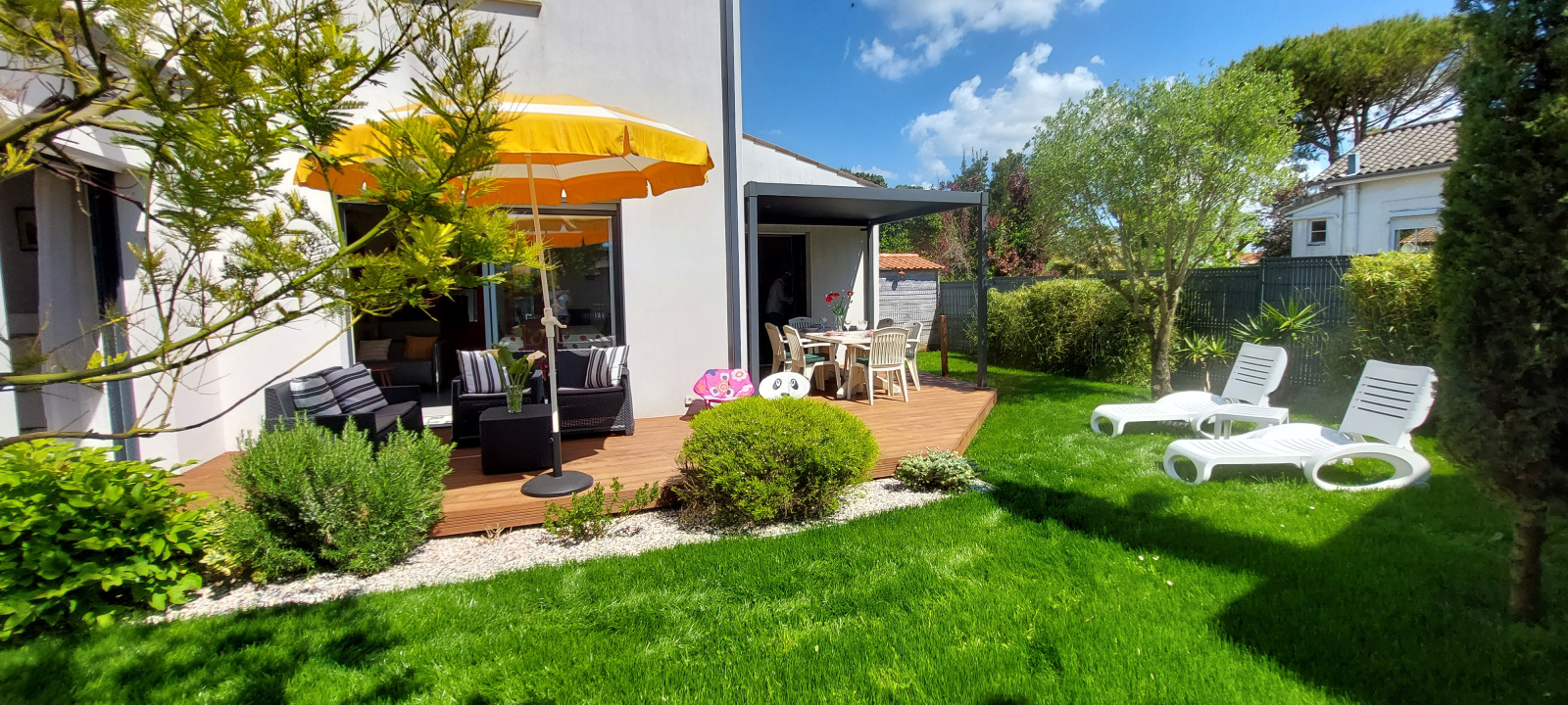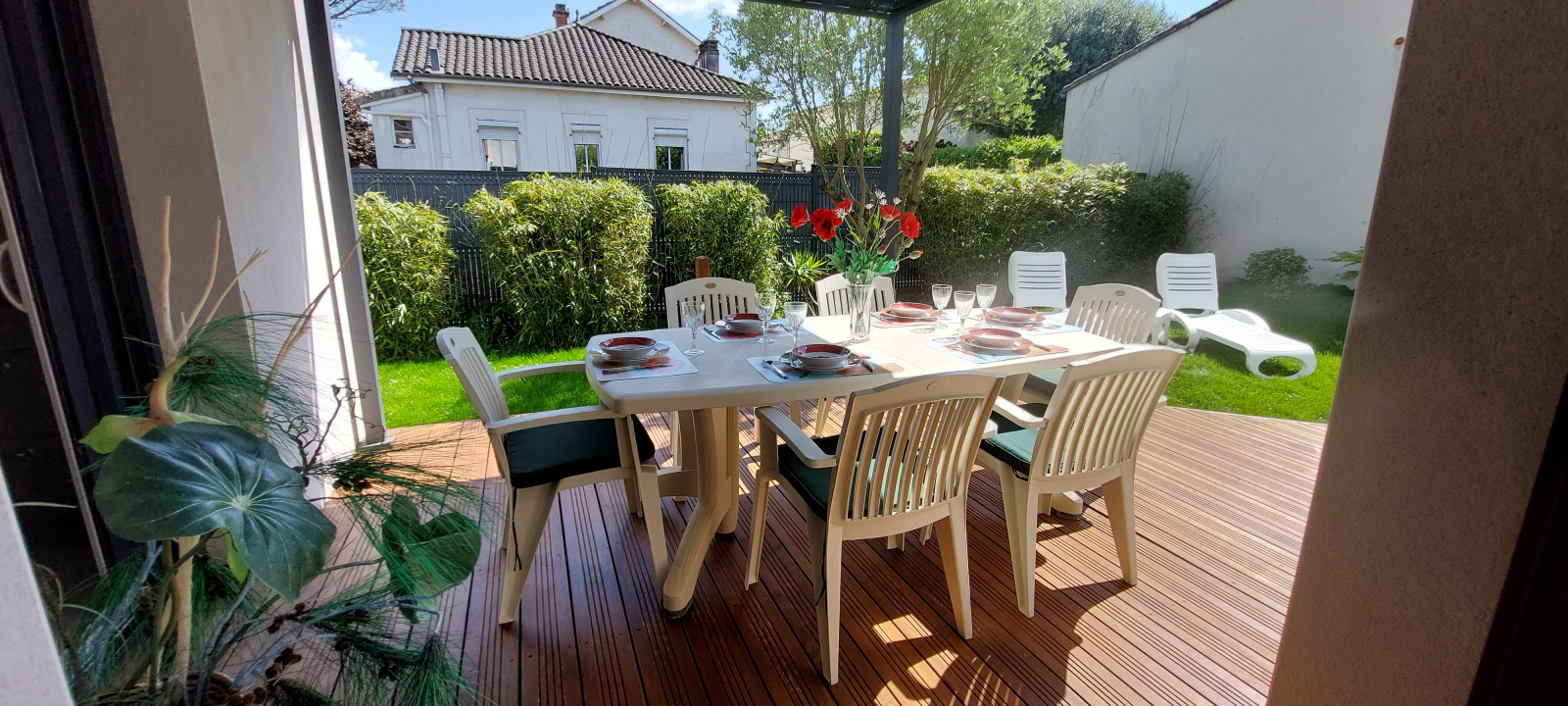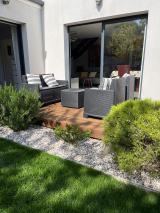 Beau JARDIN et TERRASSE avec salon de jardin, une partie de la terrasse est couverte (carport)