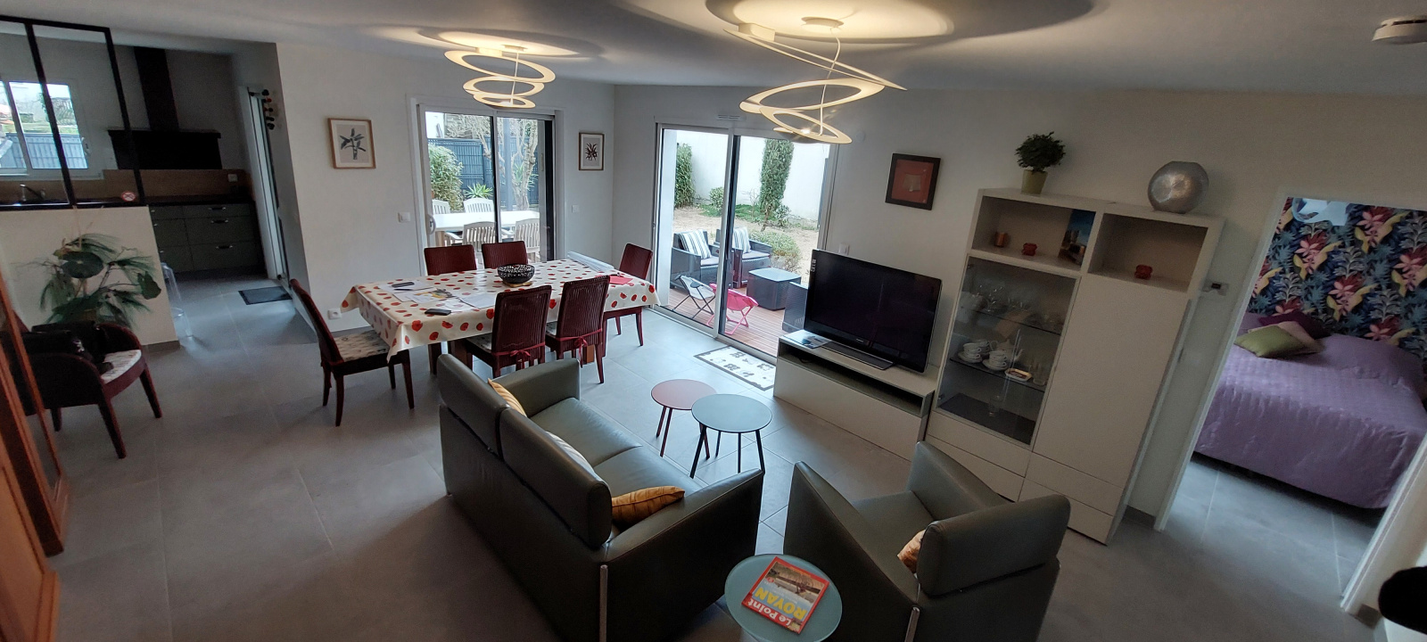 UNE ENTREE - SEJOUR SALON avec canapé, TV - CUISINE entièrement équipée d’un four, hotte, plaque à induction, réfrigérateur, micro-onde, cafetière filtre + Nespresso, évier 1 bac, lave-vaisselle- CELLIER avec lave-linge-- UNE CHAMBRE parentale avec lit de 160 et salle d'eau avec douche, lavabo et sèche serviette – WC séparé.
