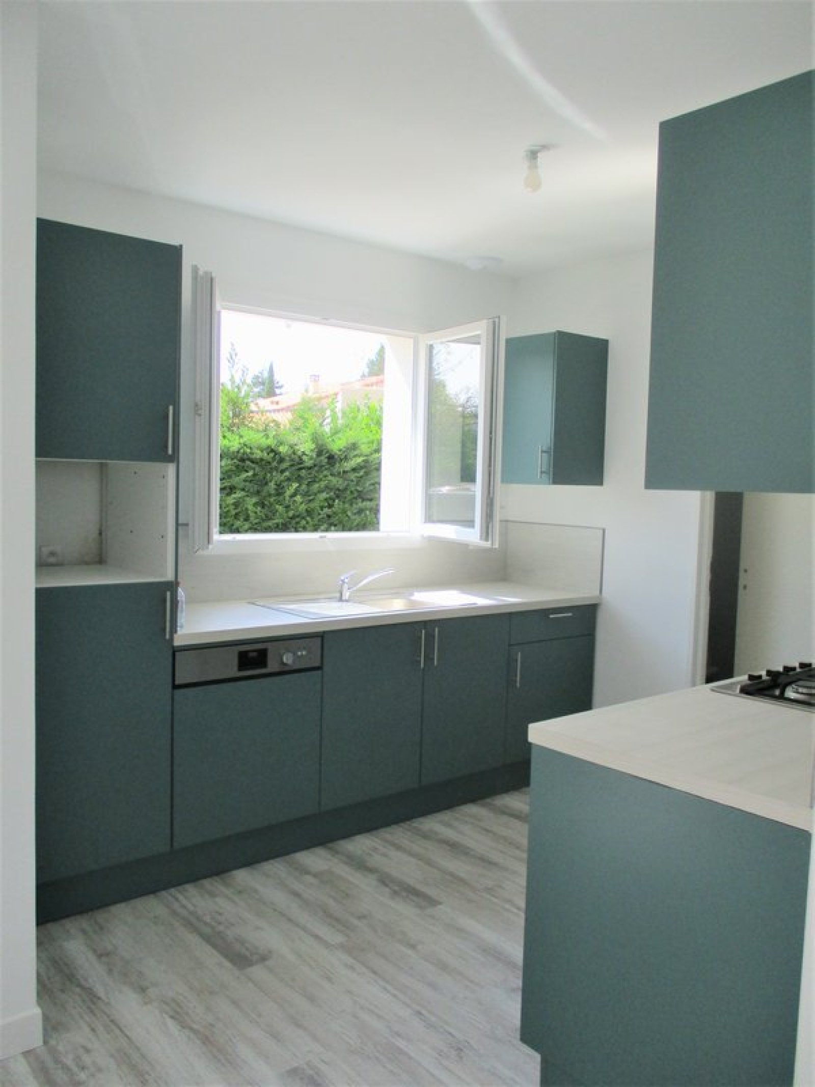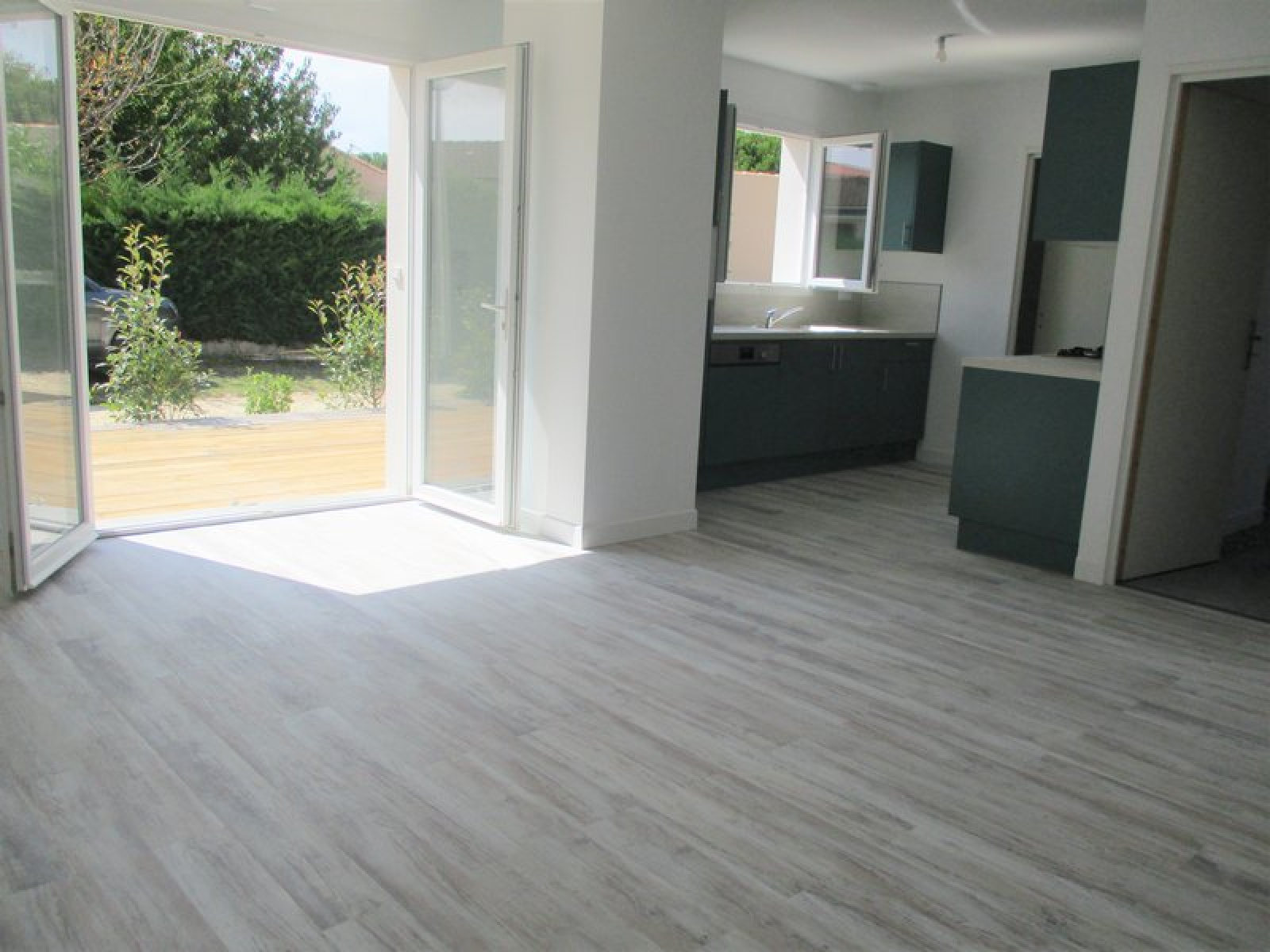 VENDUE - Maison de plain-pied neuve composée: Entrée, un séjour salon donnant sur une terrasse de 20m², cuisine équipée ouverte, cellier, 2 chambres, salle d’eau, WC, jardinet, parking, très bon investissement.